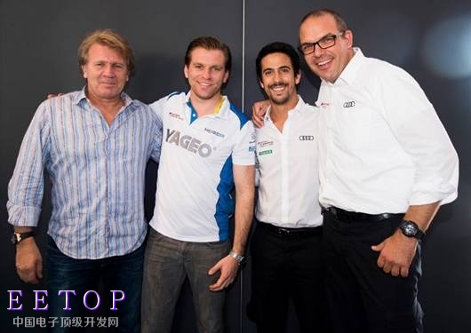 图从左依次为:儒卓力CEO Thomas Rudel,赛车手Fabian Plentz 和 Lucas di Grassi, 奥迪赛车部门客户赛车主管ChrisReinke