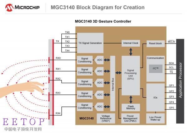 Microchip全新的手势控制器以电容技术为基础,适用于大量可减少驾驶员分神和提高车辆操作便捷性的应用,是导航信息娱乐系统、遮阳板操作、车内照明和其他应用的理想之选。这项技术还支持开启脚控后升车门和制造商希望通过简单的手势集成到车内的任何其他功能。MGC3140获得了汽车电子委员会AEC-Q100认证,满足汽车系统设计严格的电磁干扰(EMI)和电磁兼容性(EMC)要求。每个3D手势系统都包含一个传感器和Microchip手势控制器,传感器可以使用任何导电材料制成,而手势控制器是专为特定应用而打造的。