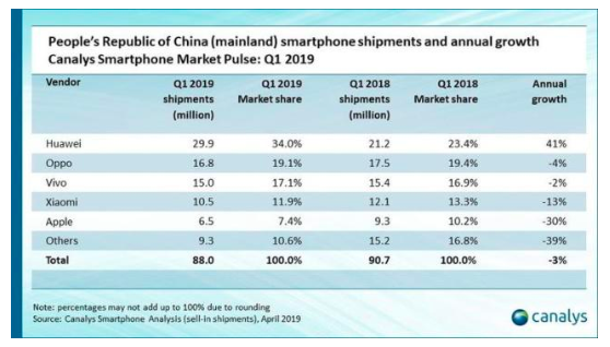分析师对iPhone在中国市场的表现太不并不乐观。市场调研机构 Canalys 在4月30日发布了关于中国智能手机市场的最新出货量统计报告。报告显示,2019 年第一季度,苹果 iPhone 在中国出货量同比下降了 30%。不过需要指出,2019 年第一季度,中国智能手机市场同比萎缩 3%,总出货量为 8800 万部,是六年来最差的市场表现。