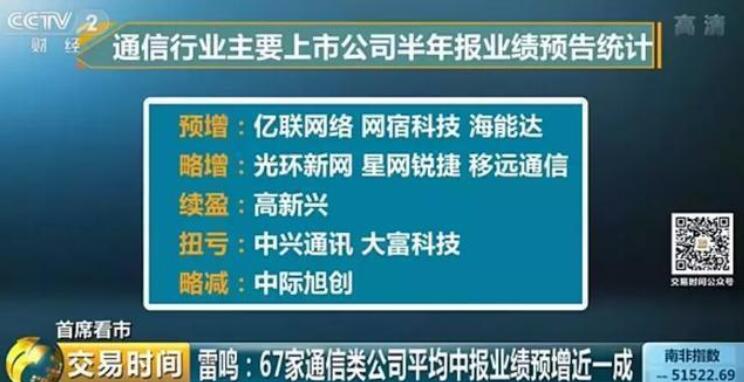 中信建投证券通信行业分析师 雷鸣:通信行业已有60余个上市公司公告了半年报业绩预告,剔除中兴通讯,总体来看,67家公司的归母净利润预告中值之和为43.89亿元,同比增长8%,而19Q1扣除中兴后同比下滑3%左右,随着5G建设初步启动,通信行业业绩反转趋势显现。
