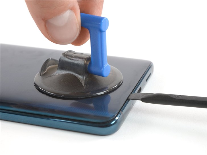 华为Mate 20 X (5G)手机的玻璃后盖粘粘并不是特别紧密,甚至不需要热风枪加热就能用翘刀和吸盘撬开。当然,随着时间的变长,胶水变硬,强度会变强,所以之后拆机可能就没那么容易了。
