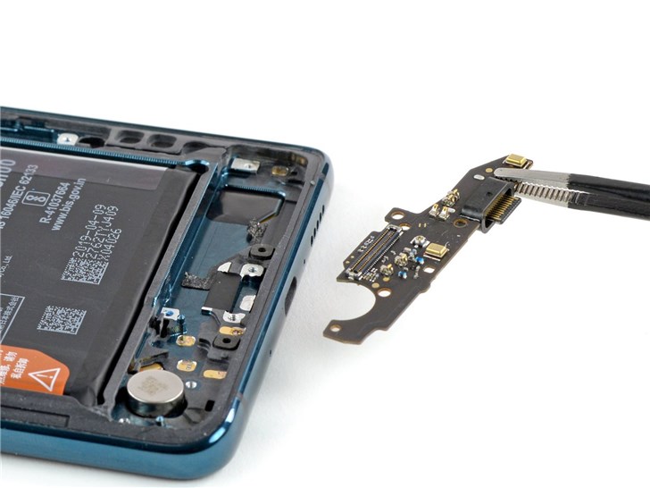 接下来就是华为Mate 20 X (5G)手机底部扬声器和USB-C接口部分,拆掉排线,然后将手机扬声器部分的撬开就可以取下USB接口了。