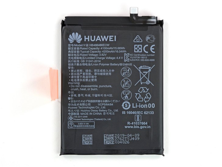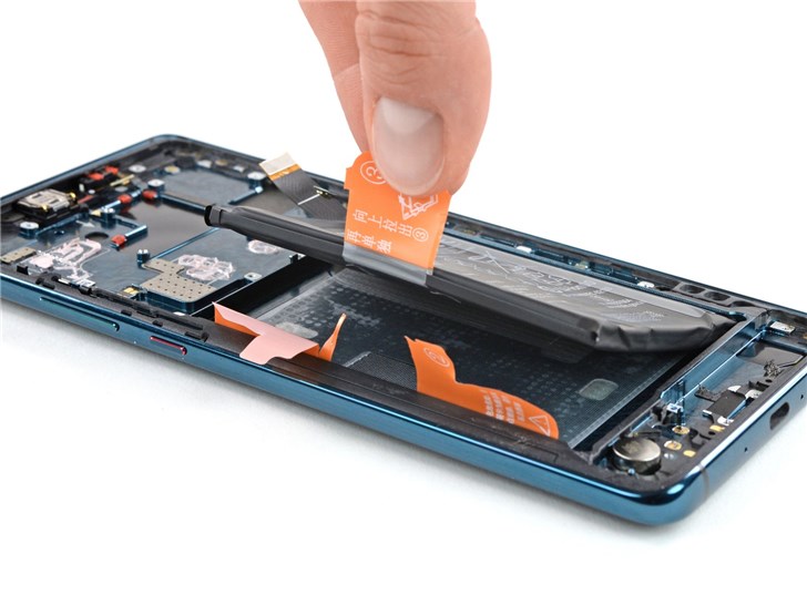 电池在去掉排线之后,只需要按照指引撕掉贴纸就能取下,华为Mate 20 X (5G)手机使用的电池与华为Mate 20 Pro一致,均为4200mAh。