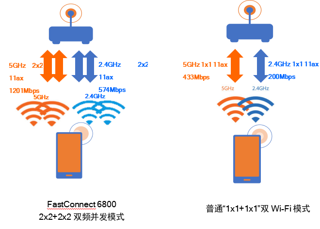 其中特别值得注意的是2×2+2×2双频并发这一特性。从去年开始,国内的头部OEM厂商比如OPPO、vivo和小米,相继推出了基于高通FastConnect 6200的双Wi-Fi的智能手机。在FastConnect 6800上,高通进一步推出2×2+2×2的双频并发Wi-Fi,可以在2.4GHz和5GHz频段,同时支持2×2的MIMO,并且是基于最高的1024QAM调制方式,一方面可以带来吞吐量的极大提升,最大的物理吞吐量可以达到1.8 Gbps。另一方面,因为两个链路同时工作,可以带来更低时延的网络效果。此外,由于能够兼顾2.4GHz和5GHz这两个网络频段,覆盖范围更大。这意味着我们通过搭载骁龙865的手机,可以在Wi-Fi 6网络条件下,同时使用2.4GHz和5GHz这两个网络频段,获得更高速率、更低时延、更广覆盖的Wi-Fi体验。