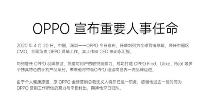 OPPO任命刘列担任全球营销总裁,沈义人卸任