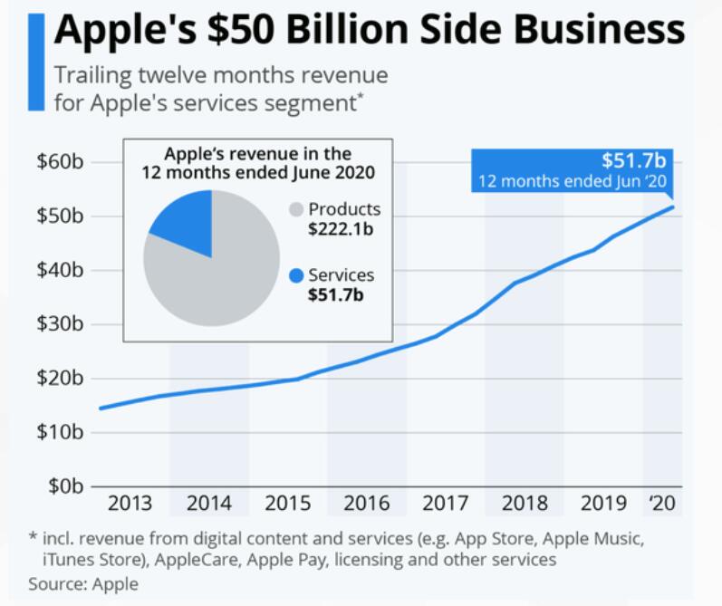 尽管510亿美元的年收入已超出了大多数公司梦寐以求的目标,但对于苹果公司如此大的规模而言仍然仅占一小部分。在截至2020年6月的12个月中,该公司产品销售额达到2220亿美元,硬件产品仍占其总营收的80%以上。