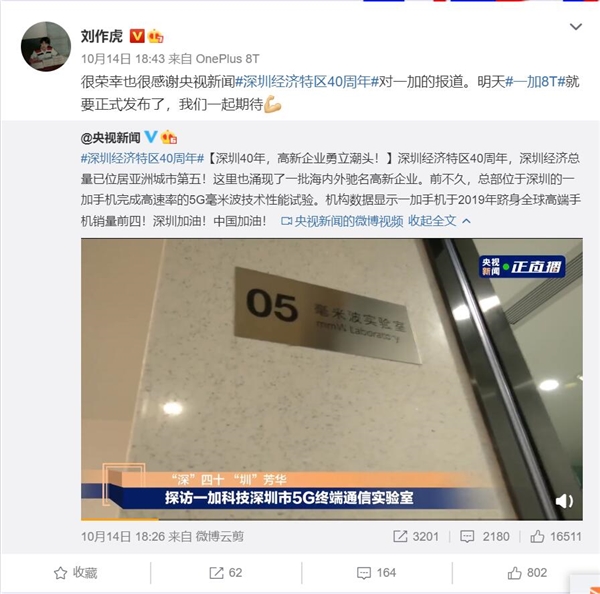 一加创始人兼首席执行官刘作虎表示,很荣幸也很感谢央视新闻深圳经济特区40周年对一加的报道。