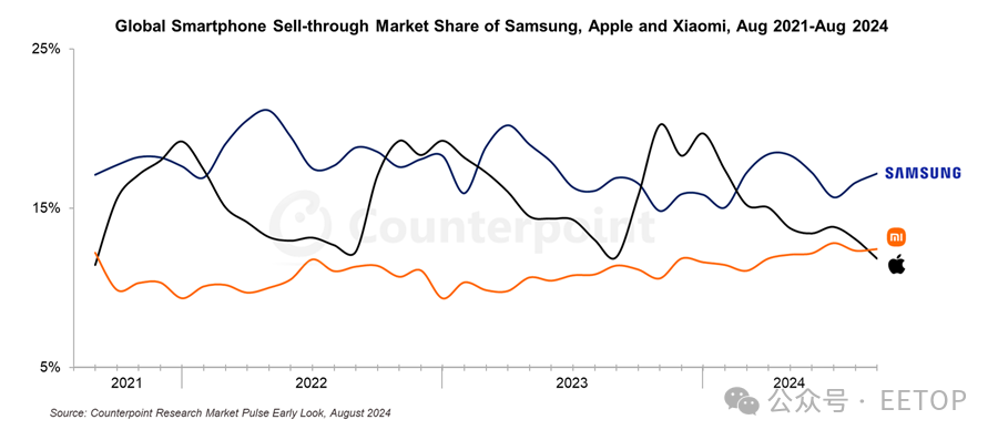 2024-09-19 11:33:10 EETOP知名消费电子行业研究机构Counterpoint Research周三发布的报告显示,在刚刚过去的8月份全球手机市场中,苹果公司时隔3年(2021年8月以来)首度被中国品牌小米超越,跌至全球第三大手机品牌。