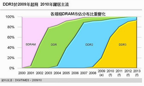 展望2010年,DIGITIMES Research认为,随全球景气持续复苏所带动PC产品销售提升,加上Windows 7推出,势必加快对DDR3的需求,更重要者在于,目前DDR3的价格与DDR2相较更具有竞争优势。以上种种原因,也让DDR3有机会成为2010年高成长产品,亦为低迷许久的DRAM市场希望所在。