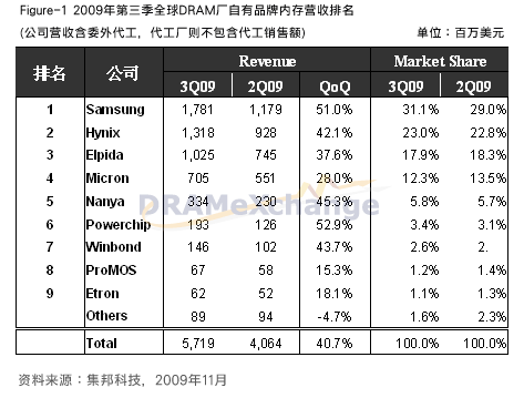 根据集邦科技统计,2009年第三季全球DRAM产业营收为57.19亿美元,与2009年第二季相比,上涨了40.7%。其中韩系厂商三星在DRAM合约价上涨、制程持续转进50nm使季位成长约10%以及提高DDR3的生产比例下,其第三季DRAM营收涨幅高达51%,为17.81亿美元,市占率上升2.1%至31.1%,稳占DRAM产业龙头宝座。韩系厂商海力士(Hynix)第三季DRAM营收在季均价上涨26%以及季位成长12%的影响下,营收上涨42.1%,为13.18亿美元,市占率上升0.2%至23%,位居DRAM产业营收第二名。