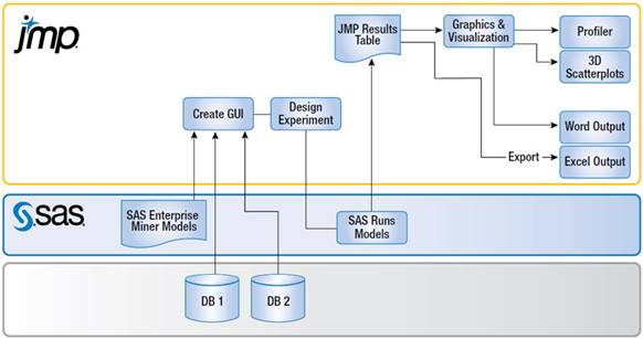 第三, 这些试验被送到SAS中进行建模计算。SAS执行这些试验并进行复杂的建模,并将包含有重要建模信息的数据表返回到JMP。