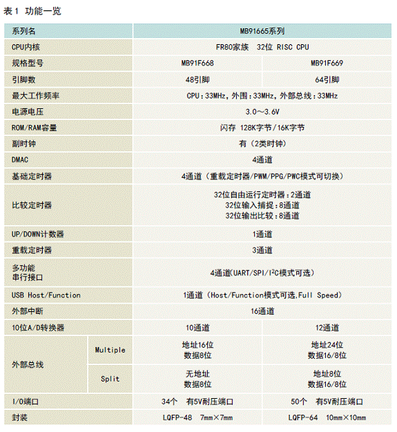 富士通在32位微控制器FR80家族中,新近增加了低引脚数USB微控制器MB91665系列。