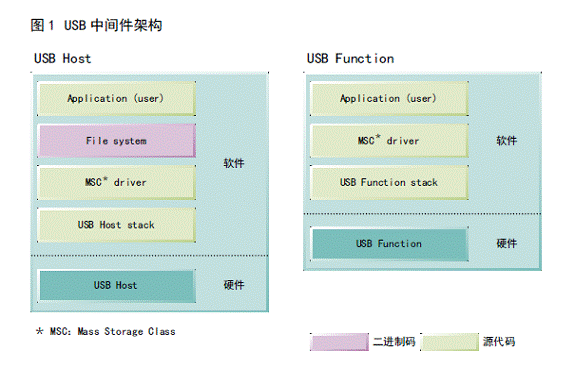 富士通在该系列产品中内置了独立研发的U S B宏,并免费提供与之配套的USB中间件(样本程序)。USB Host中间件提供U S B H o s t s t a c k、M a s s Storage Class和File System(二进制码),U S B F u n c t i o n中间件提供USB Function stack和Mass Storage Class。