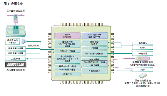 通过该产品的USB Host功能,可将各种传感器数据送至A/D转换器处理并保存到U SB存储器。而各种检测功能则不仅能够应用于体重计和打印机等带有USB的设备,还可以为既存系统提供USB控制。