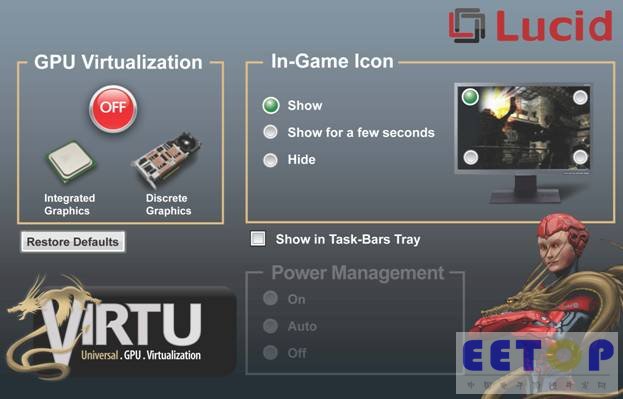 Virtu Universal可动态分配Intel第二代Core处理器以及AMD Brazos和Bulldozer平台上的集成GPU和独立GPU的图像资源,因此系统可以充分利用两种GPU提供的处理性能。通过这个软件,消费者将无需再从普遍的媒体处理功能(如Intel QuickSync视频转码和DirectX 11 3D游戏性能)中进行选择,Virtu可提供兼顾两者连贯同步的性能。