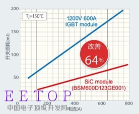 搭载ROHM生产的SiC-SBD和SiC-MOSFET的全SiC功率模块,与普通的同等额定电流的IGBT模块相比,开关损耗降低64%(芯片温度150℃时)。因此,可降低应用的功率转换损耗,实现进一步节能。