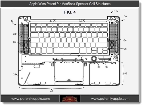 2012-05-05 15:34:30 本站原创当地时间5月2日,美国专利和商标局(US Patent and Trademark Office)批准苹果公司新获得37项技术和设计专利,其中就包括有关MacBook笔记本的扬声器设计。