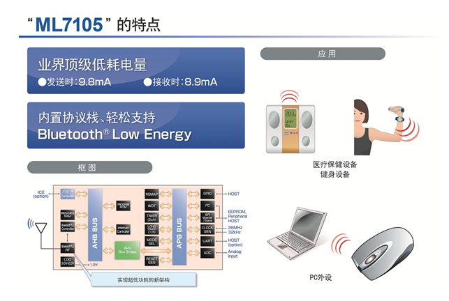 罗姆集团旗下的LAPIS Semiconductor面向运动健身器材、医疗保健设备等开发的支持Bluetooth® v4.0 Low Energy注1的2.4GHz无线通信LSI“ML7105”现已开始出售样品。本LSI的最大特点是,实现了业界顶级的低耗电(发送时9.8mA,接收时8.9mA※),凭借纽扣电池等小型小容量电池进行长时间使用成为可能。本LSI内置Bluetooth®无线通信所需的协议栈,可使现有的终端产品以最简洁的结构实现无线化。本商品从2012年9月份开始出售样品,计划于2013年3月开始量产出货。