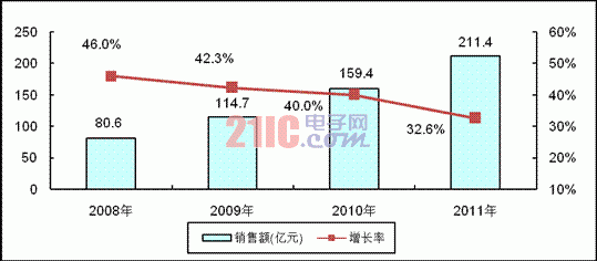 2012-11-06 20:31:09 本站原创随着国家政策的大力推动,制造成本的下降和发光效率等技术的不断突破,LED对传统照明市场的替代效应极大激发了半导体照明市场的需求。2011年,中国半导体照明市场规模为211.4亿元,同比增长32.6%。半导体照明替代传统照明而产生的市场空间巨大,这使得未来几年中国半导体照明市场都将保持高速平稳的增长态势。