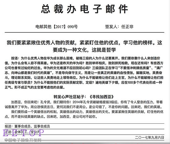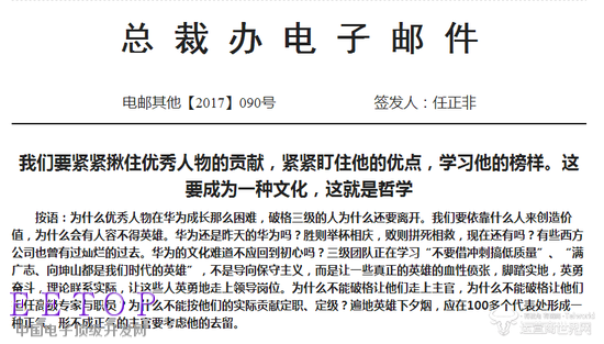 9月6日,华为的内部论坛“心声社区”再次转发了华为总裁办的电子邮件,华为创始人、总裁任正非针对两年前被破格提拔三级的一位员工最终离职事件作出批示:我们要紧紧揪住优秀人物的贡献,紧紧盯住他的优点,学习他的榜样。这样成为一种文化,这就是哲学。