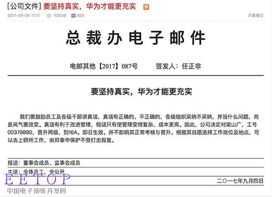 邮件内容为:“我们要鼓励员工及各级干部讲真话,真话有正确的、不正确的,各级组织采纳不采纳,并没什么问题,而是风气要改变。真话有利于改进管理,假话只有使管理变得复杂、成本更高。因此,公司决定对梁山广,工号00379880,晋升两级,到16A。即日生效。并不影响其正常考核与晋升。根据其自愿选择工作岗位及地点,可以去上研所工作,由邓泰华(华为无线产品线总裁)保护不受打击报复。”