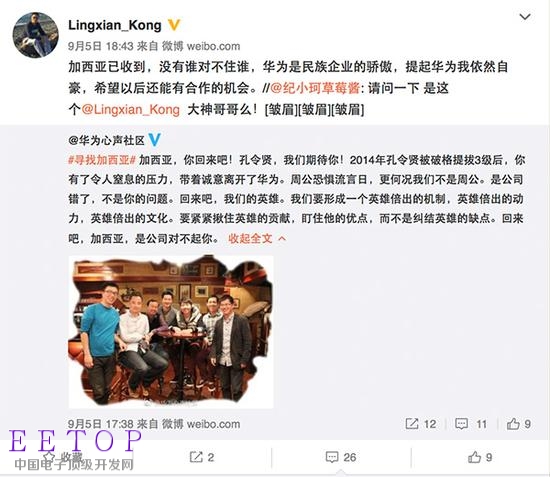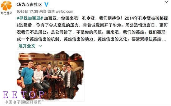 第二部分转发的是华为内部论坛名为《寻找加西亚》的帖子,主要内容十分动情:“加西亚,你回来吧!孔令贤,我们期待你!2014年孔令贤被破格提拔3级后,你有了令人窒息的压力,带着诚意离开了华为。周公恐惧流言日,更何况我们不是周公。是公司错了,不是你的问题。回来吧,我们的英雄。”