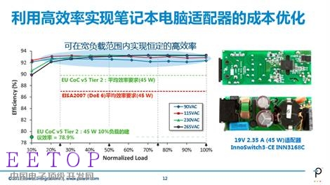 图4为19V 2.35 A (45 W)适配器采用InnoSwitch3-CE INN3168C,利用高效率实现笔电适配器的成本优化,可在宽负载范围内实现恒定的高效率。