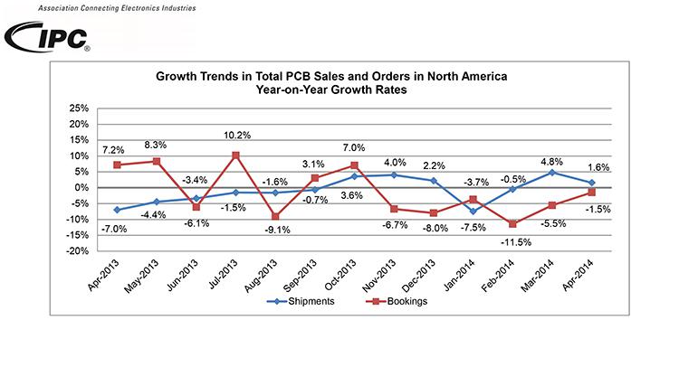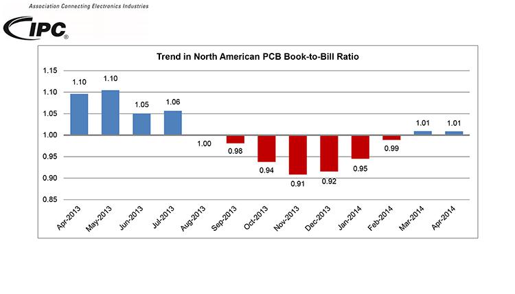 2014-06-03 21:31:22 本站原创IPC-国际电子工业联接协会®日前发布《4月份北美地区PCB行业调研统计报告》,报告显示4月份的销售量同比稍有增长,订单出货比仍在良性区域达到1.01。