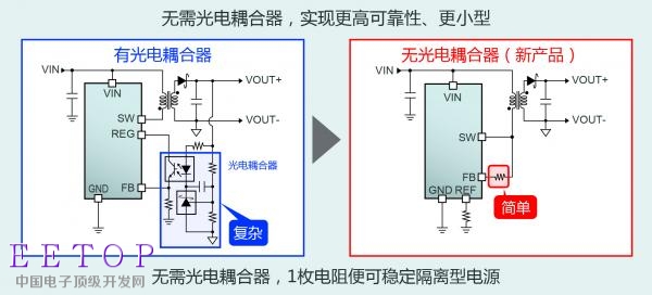 一直以来,隔离型电源的控制部件多使用光电耦合器等部件,其电路复杂和经年老化等可靠性课题也务求改善。