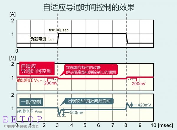 利用新开发的自适应导通时间控制技术,实现输出电压变动是一般控制方式的65%以下,仅为200mV(负载电流1A、上升100μs时),改善了瞬间负载电流变动对负载响应特性的影响,非常有助于提高可靠性。