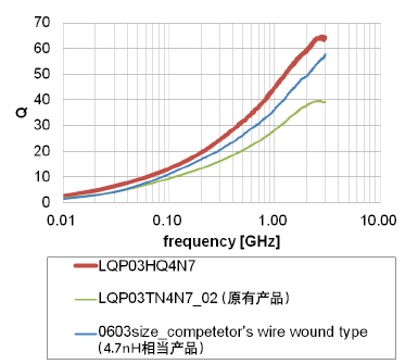 本产品应用了我公司独创的最新微细加工技术,制成最合适的线圈模式的同时,通过采用了L型电极结构,实现了0201尺寸多层 (薄膜) 型电感器世界最高等级的Q值特性。新系列LQP03HQ4N3 (电感值4.3nH) 在2.0GHz频段更达到了Q值63,与我公司原有的LQP03TN4N系列产品的Q值39相比,大约提升了60%。