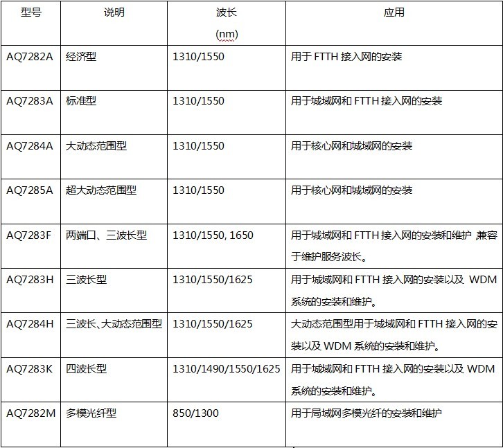 AQ7280系列共有9个型号,包括AQ7285A和AQ7283K。AQ7285A拥有行业领先的50dB动态范围,适用于长距离测量,而AQ7283K最多可测量四个不同波长。作为一个模块化的测量单元,用户可以在现场更换测量模块,这使AQ7280系列拥有无与伦比的灵活性和方便性。通过更换测量单元,AQ7280系列可以灵活对应因光通信技术发展而产生的新的测量需求。