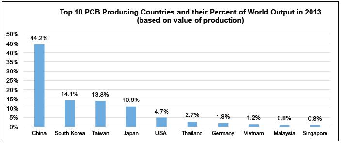 2013年十强PCB生产国及其在全球PCB产值中的份额