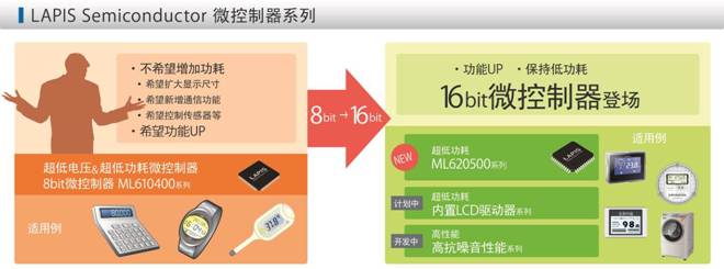 为了满足这些需求,LAPIS Semiconductor以在8bit低功耗微控制器中获得高度好评的低消耗电流技术为基础,开发出低功耗且多功能、高性能的16bit低功耗微控制器系列。