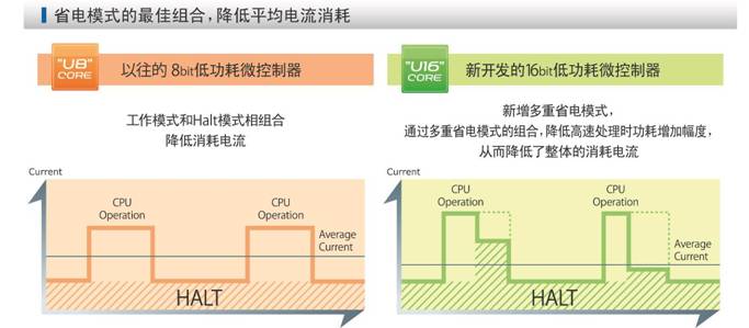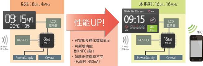 针对以往的8bit、4MHz运行的CPU无法处理的功能,此次开发的新产品性能大幅提升,总线宽度提升了2倍,达16bit;工作频率提升了4倍,达16MHz;Halt时的消耗电流成功保持了与以往产品同等的值450nA。因此,该系列产品不仅保持了低功耗,而且,还使图形化的液晶显示控制和通信控制等以前无法实现的高性能处理成为可能。
