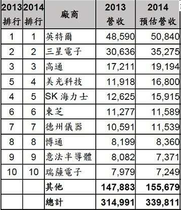 2014年全球营收前十大半导体厂商 (单位:百万美元)