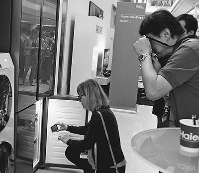 中国首次有两家品牌企业参加2015年柏林国际消费电子展全球媒体大会。图为海尔集团推出的新产品吸引了不少媒体记者。本报记者 管克江摄