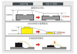 另外,利用ROHM独有的生产技术实现元件的薄型化、金引线的低环路化,从而实现PICOLED TM系列最大的特点---业界最薄的0.2mm厚度。这非常有助于小型移动设备要求的小型薄型化。