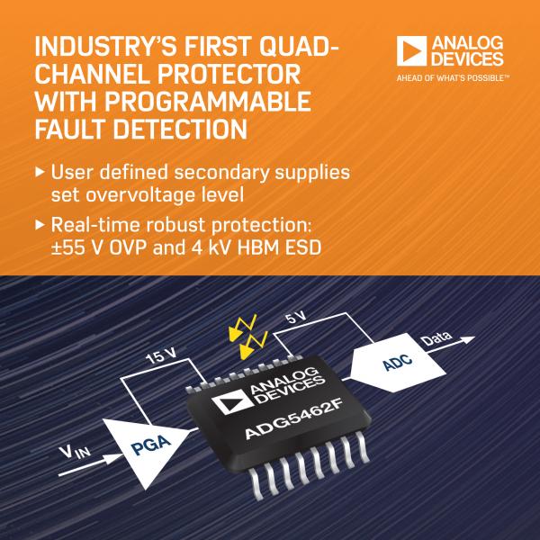 ADG5462F | 四通道保护器 | 副电源 | 可选副电源或开路 | 故障指示 | 16引脚 TSSOP/ LFCSP |
