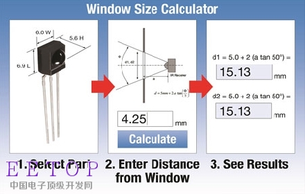 “红外接收器、红外收发器和光传感器都要求有一个窗口或是在玻璃罩上开口,这样在遥控器里才能起作用。”Vishay的美洲光电子产品区域市场总监Jim Toal说,“目前的情况是,计算这些窗口的尺寸意味着要从应用笔记里找出计算公式,还要使用带正切角等几何函数的计算器。对于设计者来说,我们这个新的计算工具能有效节省时间,他们只要点几下鼠标,就能轻松完成设计。”