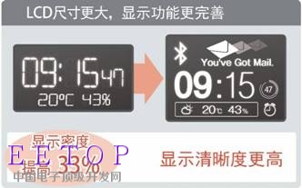本LSI内置可驱动最大2048点阵(64 segment x 32 common)显示屏的LCD驱动器,与本公司以往产品相比,显示量也提高了33%。因此,可在手表画面上以更高的清晰度来展现计量到的步数、活动量信息的图表及智能手机接收到的邮件信息显示等。