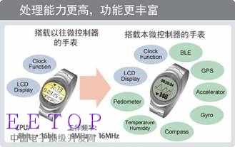 与以往的手表用微控制器(8bit/4MHz)相比,处理能力提高了4倍以上(16bit/16MHz)。由此,可实现比如陀螺仪传感器和地磁传感器等的偏移校正算法处理,支持步行导航等更高级的应用。