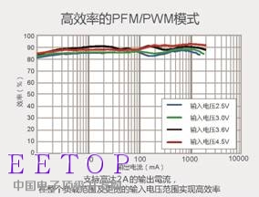 该模式在负载变动时可自动切换PFM和PWM,从而在整个负载范围内可实现达90%的高效率。非常适用于智能手机和平板电脑等工作切换频繁、重视效率的应用。