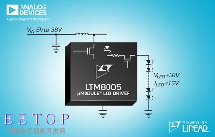Analog Devices Inc. (ADI)宣布推出 Power by Linear™ LTM8005升压型 DC/DC μModule® (电源模块) 稳压器,这是专为驱动 LED 而设计。LTM8005 将一个 DC/DC 控制器、电源开关、肖特基二极管和电流检测电阻器置于一个 9mm x 11.25mm x 2.22mm BGA 封装中。LTM8005 可在 5V 至 38V 的输入电压范围内工作,并能在高达 38V 的输出电压下提供高至 1.6A 的稳定电流。采用了一个外部电感器,因而使得 LTM8005 能够利用一个耦合电感器容易地配置在不同的操作模式,包括升压、降压-升压、降压和 SEPIC 拓扑。