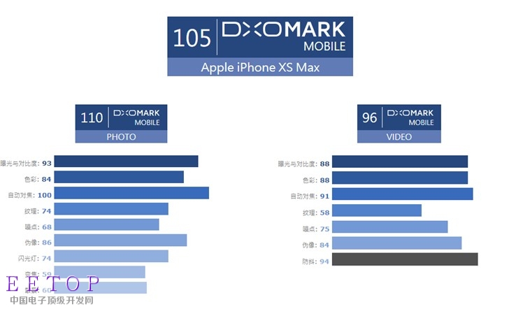 DxO给苹果iPhone XS Max照片打出110分,其中曝光于对比度93分,色彩84分,自动对焦100分,纹理74分,噪点68分,伪像86分,闪光灯74分,变焦59分,散景60分。