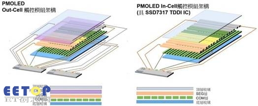 “PMOLED Out-Cell 触控模组架构” 与 “PMOLED In-Cell触控模组架构(具SSD7317 TDDI IC)”