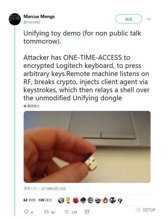 然而本周早些时候,安全专家Marcus Mengs表示罗技的无线Unifying dongles实际上依然存在漏洞,非常容易受到黑客的攻击。当用户配对新的鼠标或者键盘时候,就有机会入侵你的电脑。