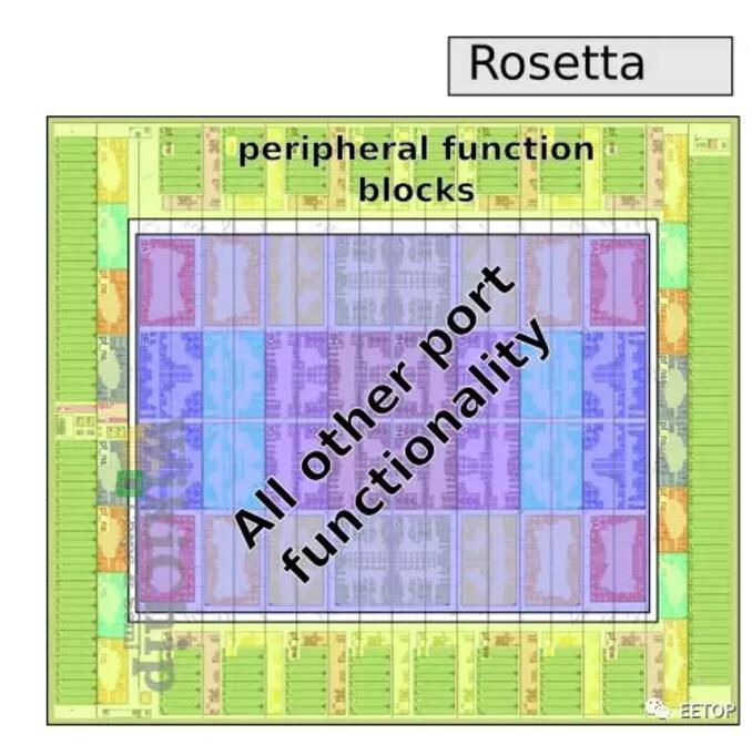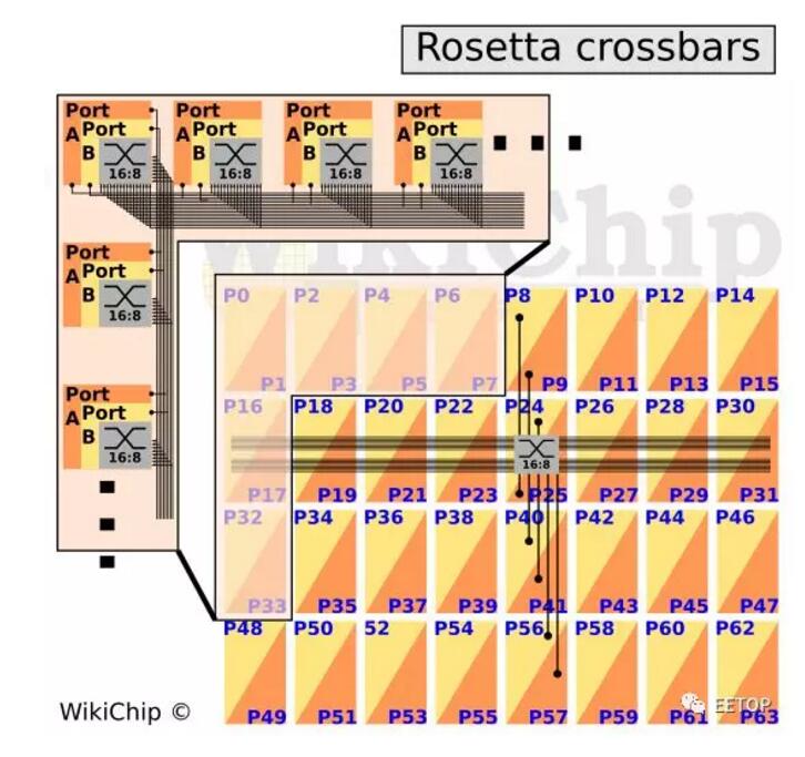 在内部,该芯片包括32个功能块,排列成四行乘八列。每个图块有两个交换机端口,因此有32个功能块,您正在查看完整的64个端口。Rosetta是使用分层交叉交换实现的。每个端口都有自己的行总线,该行总线跨行通信。有一组八列通道连接到该列中的八个端口。由于每个图块有两个交换端口,因此在八列通道集中有两个。每个图块都有一个16输入8输出交叉开关。