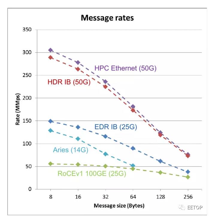 允许将数据包轻松地从一种形式转换为另一种形式。以太网的最小帧大小为64字节(18字节报头+ 46字节有效负载)。HPC以太网摆脱了这一限制,以40字节帧(或32字节加上边带)为目标。它改变了报文头,使其尺寸尽可能减小–减少了前同步码,删除了L2报头。还引入了基于信用的流量控制,该流量控制的设计比现有机制更加有效。为了提高弹性,提供了低延迟FEC,链路级重试以容忍瞬态错误(针对CRC错误在链路级进行重传)以及通道性能下降(例如从4通道变为3通道或3通道降低)。在Cray的分析图中,下面绘制了消息大小与每秒可发送的百万个数据包的关系图,很明显,与标准以太网相比,HPC以太网由于消息头小得多而在较小消息大小时效率更高。HPC以太网可以与HDR Infiniband相媲美,后者是另一个非常好的HPC网络互连。