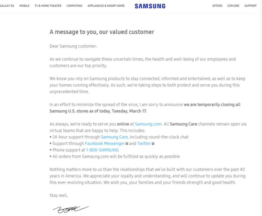 “我们知道您依靠三星产品来保持联系,获得消息和娱乐,并保持房屋有效运转。因此,我们正在采取步骤,在前所未有的时间内为您提供保护和服务。”